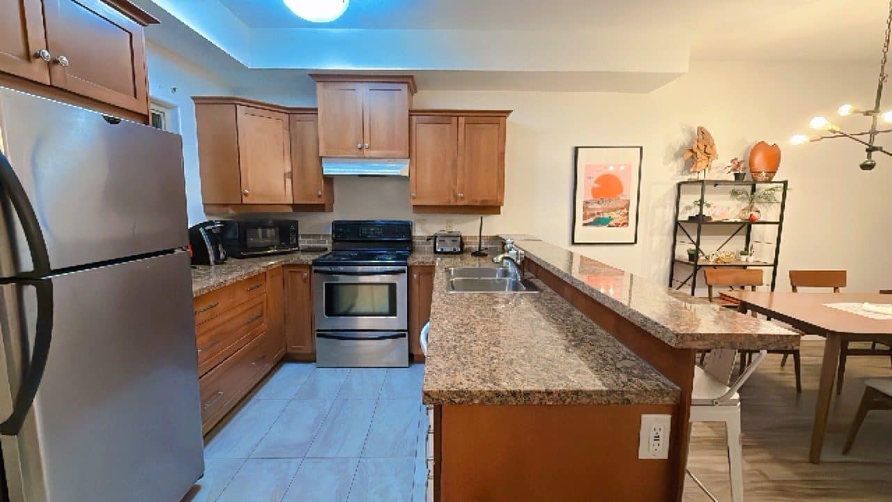 Discover this stylish and spacious 3-bedroom townhouse, perfect for families or groups. The master bedroom features a luxurious king bed with an ensuite bathroom, while the second bedroom offers a cozy queen bed. The third bedroom is ideal for extra guests or kids, with comfortable queen bunk beds. With a total of 2.5 bathrooms, a generous living room, and a well-equipped kitchen on the top floor, this home provides the perfect blend of comfort and convenience for your stay.