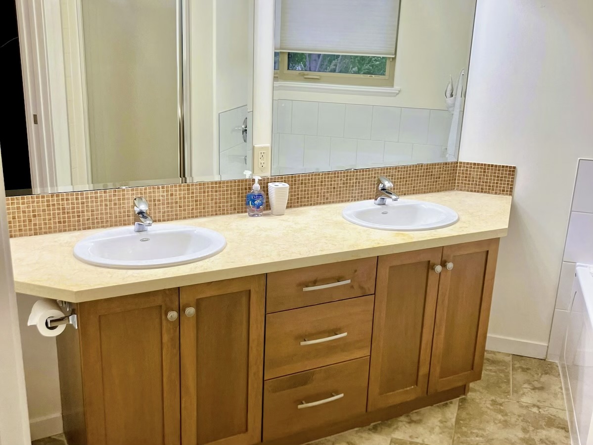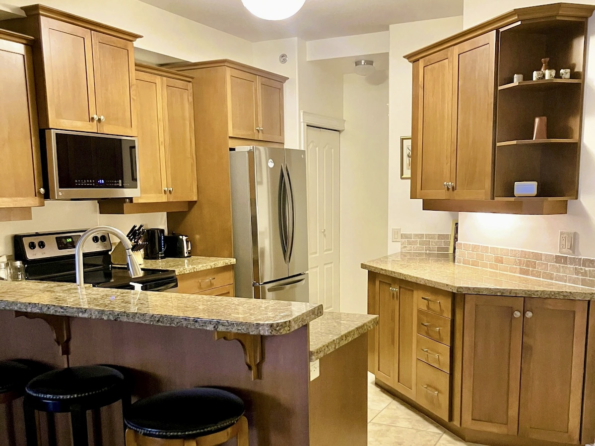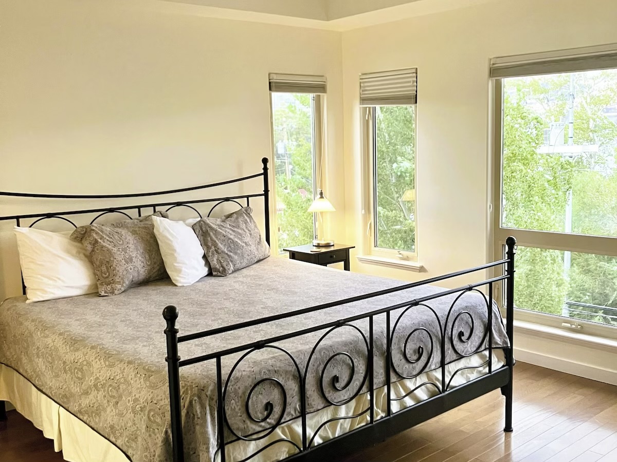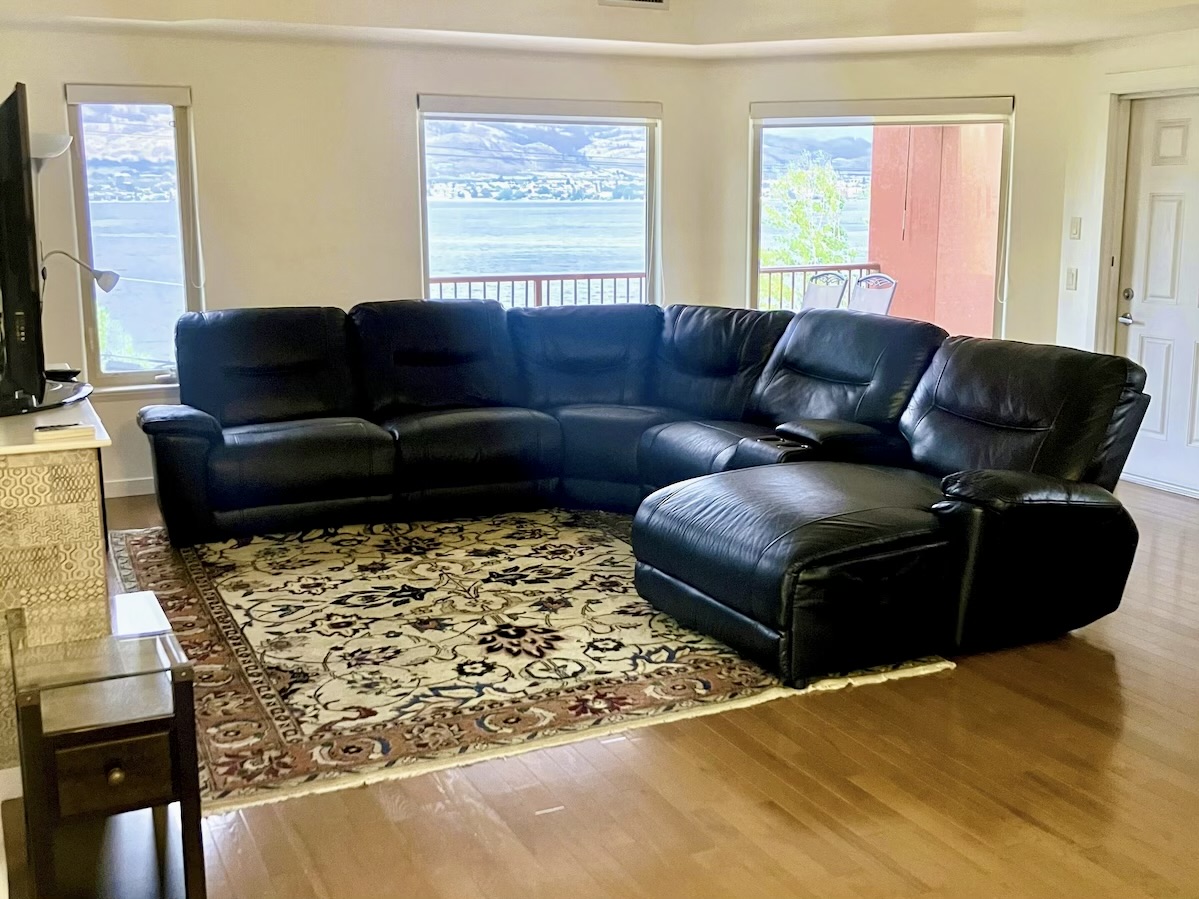 The deck off the great room, directly overlooking the lake, is over 300 square feet and has a table that seats six, a propane barbecue, and extra lounge chairs. The great room has a 65 inch flat screen TV over an electric fireplace. The master bedroom has a 42 inch flat screen TV. The master bathroom accessed via a walk-through closet features a double vanity, separate shower and tub. High speed internet and a large selection of cable channels are available in this unit. The condo has air conditioning, a water softener and a washer dryer unit.